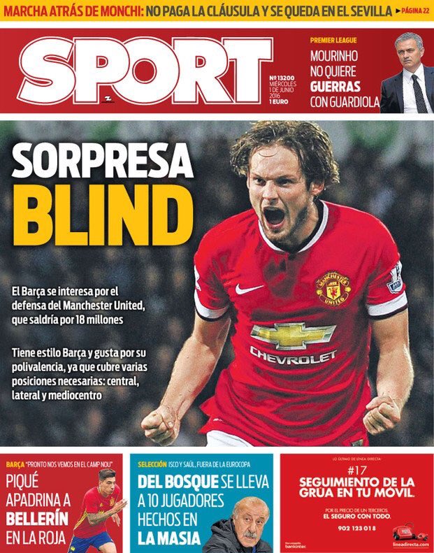 Barcelona are interested in signing Daley Blind and Manchester United are willing to allow the defender to leave for €18m, according to Sport."?