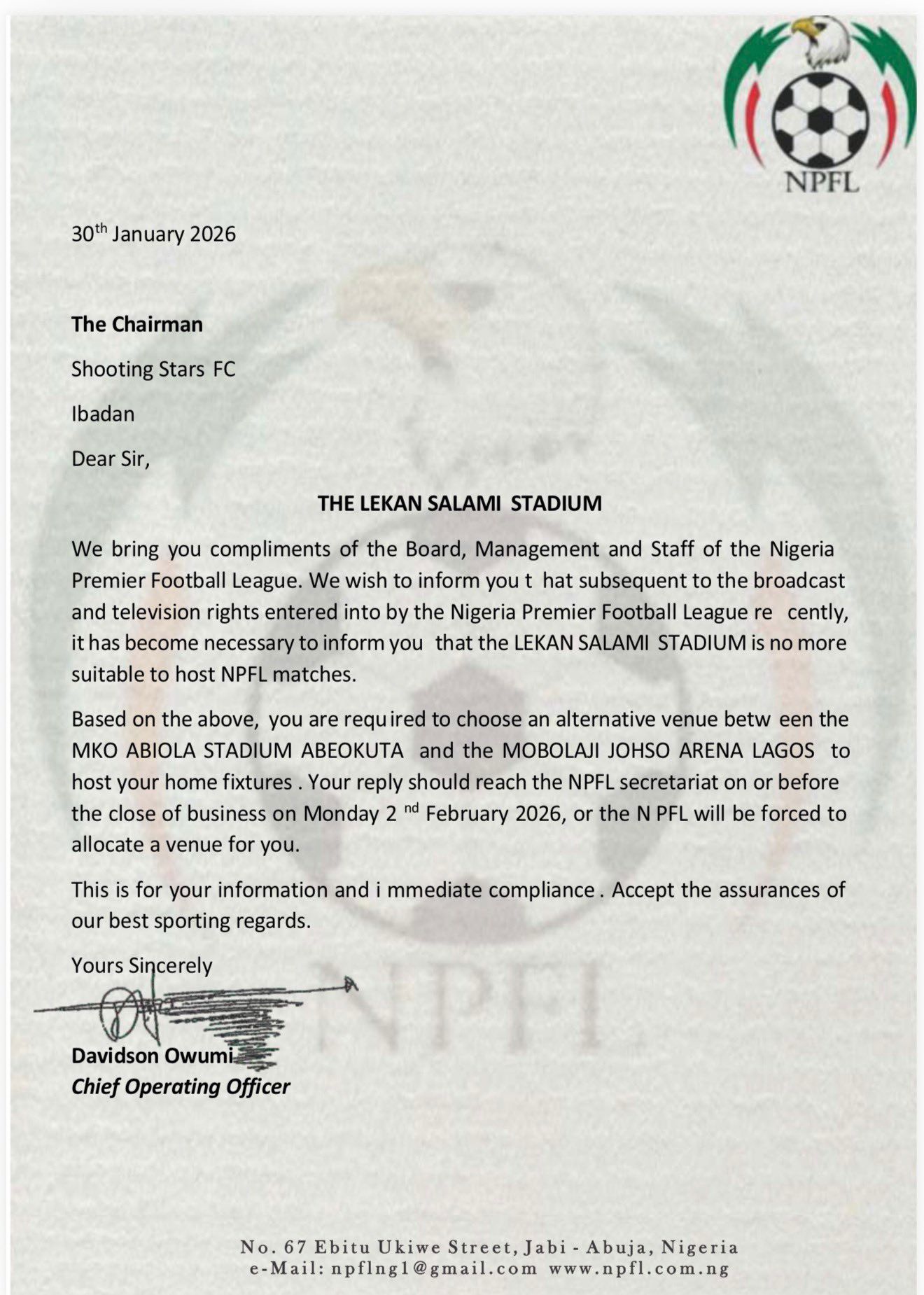 The Nigeria Premier Football League (NPFL) has directed Shooting Stars Sports Club (3SC) to stop using the Lekan Salami Stadium, Ibadan, as their home ground for the remainder of the 2025/2026 season, Nigeriasoccernet.com reports.